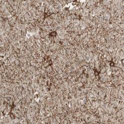 - Immunohistochemical staining of human hippocampus shows strong cytoplasmic positivity in glial cells.