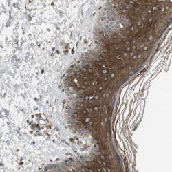 - Immunohistochemical staining of human skin shows strong cytoplasmic positivity in epidermal cells.