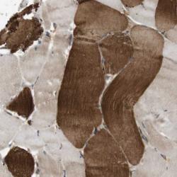- Immunohistochemical staining of human skeletal muscle shows distinct cytoplasmic positivity in myocytes.