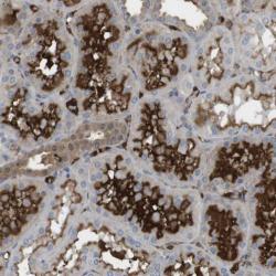 - Immunohistochemical staining of human kidney shows strong membranous positivity in cells in tubules.