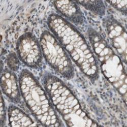 - Immunohistochemical staining of human rectum shows moderate cytoplasmic positivity in glandular cells.