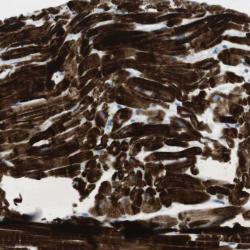 - Immunohistochemical staining of human heart muscle shows strong cytoplasmic positivity in myocytes.