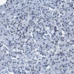 - Immunohistochemical staining of human pancreas shows strong nucleolar positivity in exocrine glandular cells.
