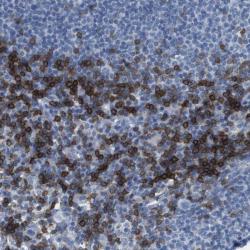 - Immunohistochemical staining of human lymph node shows strong cytoplasmic positivity in lymphoid cells outside reaction centra.