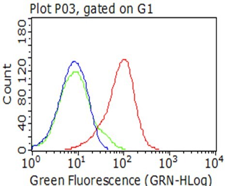 - Flow cytometric analysis of living 50 ng/mL IL2-stimulated Jurkat cells, using anti-CD5 antibody (TA802423), (red), compared to an IgG isotype control, (green), and negative control (PBS), (blue). (1:100)