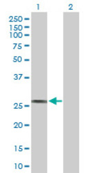 - Western Blot analysis of HLA-DRB1 expression in transfected 293T cell line (H00003123-T04) by HLA-DRB1 MaxPab polyclonal antibody.Lane 1: HLA-DRB1 transfected lysate(30.00 KDa).Lane 2: Non-transfected lysate.