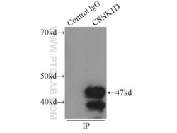 - IP result of anti-Casein Kinase 1 delta (IP:14388-1-AP, 3ug; Detection:14388-1-AP 1:1000) with HeLa cells lysate 2000ug.