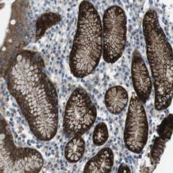 - Immunohistochemical staining of human stomach shows strong cytoplasmic positivity in glandular cells.