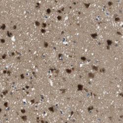 - Immunohistochemical staining of human cerebral cortex shows strong nuclear positivity in neuronal cells.