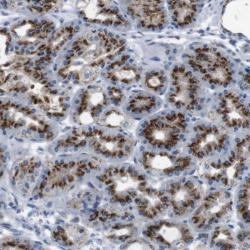 - Immunohistochemical staining of human stomach shows strong cytoplasmic positivity in glandular cells.
