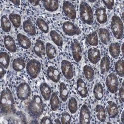 - Immunohistochemical staining of human duodenum shows moderate cytoplasmic positivity in glandular cells.