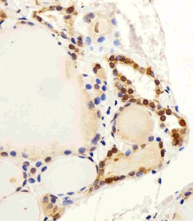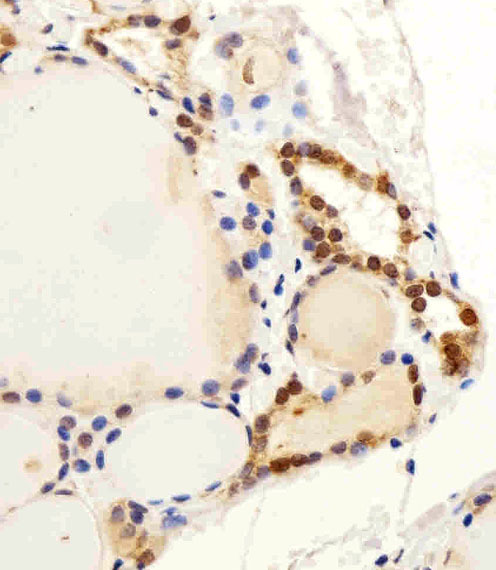 - Immunohistochemical of paraffin-embedded H.thyroid section using C13orf30 Antibody. Antibody was diluted at 1:25 dilution. A peroxidase-conjugated goat anti-rabbit IgG at 1:400 dilution was used as the secondary antibody, followed by DAB staining.