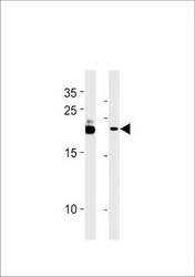 - C13orf30 Antibody (C-term) (Cat. #TA325011) western blot analysis in B-3,MCF-7 cell line lysates (35ug/lane).This demonstrates the C13orf30 antibody detected the C13orf30 protein (arrow).