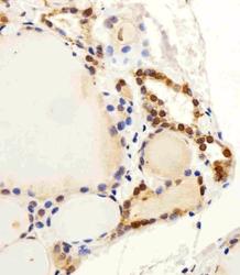 - Immunohistochemical analysis of C13orf30 in paraffin-embedded Human thyroid tissue. Samples were probed with a C13orf30 Antibody at a 1:25 dilution (Product # PA5-49344) followed by peroxidase conjugation to the goat anti-rabbit IgG secondary antibody at 1:400 dilution and DAB staining.