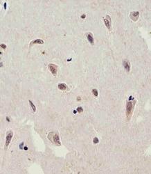 - Immunohistochemical analysis of C13orf30 in paraffin-embedded Human brain tissue. Samples were probed using a C13orf30 Antibody (C-term) (Product # PA5-49344) at a 1:25 dilution. A peroxidase-conjugated goat anti-rabbit IgG at a 1:400 dilution was used as the secondary antibody, followed by DAB staining.