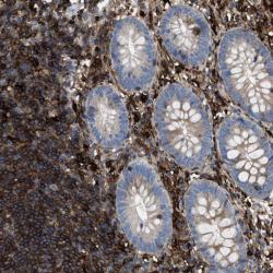 - Immunohistochemical staining of human appendix shows strong positivity in lymphoid cells.