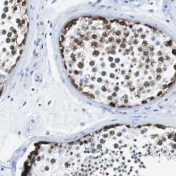 - Immunohistochemical staining of human testis shows strong cytoplasmic and nuclear positivity in cells in seminiferus ducts.