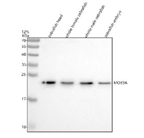 - Western blot analysis of Mob3A/B/C protein using Zebrafish Mob3 antibody and 1) zebrafish head, 2) whole female zebrafish, 3) whole male zebrafish and 4) zebrafish embryo tissue lysate. Predicted molecular weight ~25 kDa.