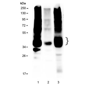 - Western blot testing of 1) rat brain, 2) rat kidney and 3) mouse brain lysate with CD47 antibody at 0.5ug/ml. Predicted molecular weight: 35~60 kDa depending on glycosylation level.