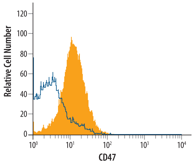 - Detection of CD47 in Human Lymphocytes by Flow Cytometry. Human whole blood lymphocytes were stained with Sheep Anti-Human CD47 Antigen Affinity-purified Polyclonal Antibody (Catalog # AF4670, filled histogram) or control antibody (Catalog # 5-001-A, open histogram), followed by Northern-Lights™ 557-conjugated Anti-Sheep IgG Secondary Antibody (Catalog # NL010).
