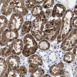 - Immunohistochemical staining of human kidney shows distinct cytoplasmic and nuclear positivity in cells in tubules.