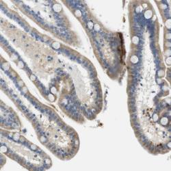 - Immunohistochemical staining of human duodenum shows moderate cytoplasmic positivity in glandular cells.
