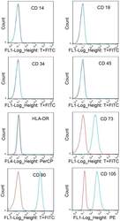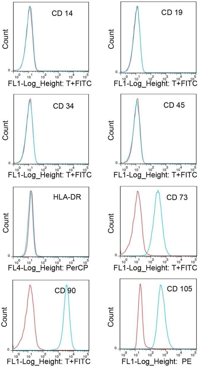 - Figure 1. Immunophenotypic profile of cultured cartilage endplate-derived stem cells. The blue lines represent the fluorescence intensity of cells stained with the indicated antibodies and the red lines represent the negative controls cells, which were stained with a non-immunoreactive isotype control antibody. FITC, fluorescein isothiocyanate; PerCP, peridinin chlorophyll; PE, phycoerythrin; HLA-DR, human leukocyte antigen-antigen D related.