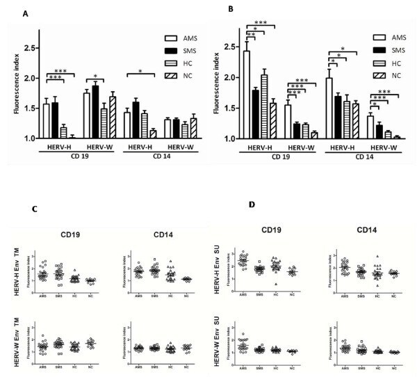 - Figure 2 Flow cytometric analysis of surface expression of HERV-H Env and HERV-W Env on B-cells and monocytes from patients with active MS (AMS), stable MS patients (SMS), healthy individuals (HC), and neurological non-inflammatory controls (NC) . The results are presented as fluorescence indices calculated as the ratio of the mean fluorescence of the cells incubated with anti-Env Abs to the mean fluorescence of the cells incubated with the appropriate control (pre-immune serum). Mean values (2A) and scatter plots (2C) for cells incubated with anti-Env TM Abs. Mean values (2B) and scatter plots (2D) for cells incubated with anti-Env SU Abs. The standard errors for each group are presented. The significant differences ( P