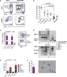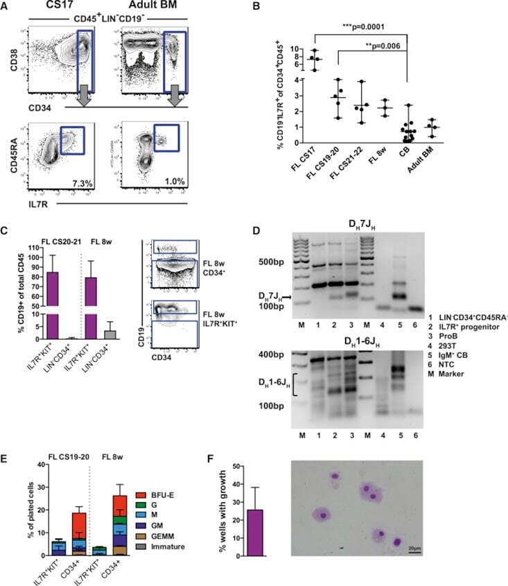 - Figure 2 Identification of a CD19 - IL-7R + Progenitor (A) Fluorescence-activated cell sorting (FACS) analysis of CS17 FL showing CD19 - IL-7R + progenitor co-expressing CD34 and CD45RA. Adult BM (right) is shown for comparison. Cells were gated CD45 + LIN - CD19 - . Further gating as indicated. Mean percentage of total CD45 + CD34 + cells. (B) Kinetics of IL-7R progenitor emergence during development as percentage of total CD45 + CD34 + cells. Each dot represents one biological sample. Mean with range. Statistical comparison versus CB control. (C) B cell potential of IL-7R + KIT + FL progenitors was tested by co-culture on MS-5 for 2 weeks. Percentage of CD19 + B cells of total CD45 + cells is shown (left) with representative FACS analysis (right). CD34 + cells were used as control. Mean +- SD, n = 2-3. (D) Agarose gel of IGH DJ rearrangements in IL-7R + FL progenitor. Top: D H 7J H recombination assay. Bottom: D H 1-6J H recombination assay. Label for lanes 1-6 is shown to the right. Marker lanes (M). Predicted D H 7J H recombination between 100 and 130 bp. Predicted D H 1-6J H rearrangements between 110 and 290 bp, n = 1 ( van Dongen et al., 2003 ). (E) GM and erythroid potential of IL-7R + KIT + FL progenitor in semi-solid media. Data show distribution of colony types as percentage of plated cells versus CD34 + cells as controls. Mean +- SD, n = 2 per developmental stage. (F) Myeloid potential of IL-7R + KIT + FL progenitor in liquid culture (20-40 cells/well). Graph show