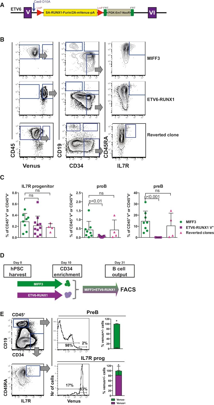 - Figure 5 An hIPSC Model of ETV6-RUNX1 Shows a Block in B Lineage Commitment (A) Genome engineering strategy. A constitutive knockin cassette, encoding a splice acceptor (SA), cDNA for RUNX1 exons II-VIII V5 tagged at the C terminus, and linked to the mVenus fluorescent reporter by a self-cleaving furin/T2A peptide is inserted by CRISPR-directed homologous recombination toward the 5'' end of ETV6 intron V. The cassette is flanked by LoxP sites and includes a 3'' triple stop/poly(A) tail followed by an FLP floxable NeoR + selection cassette. (B) Control MIFF3 (top panel), ETV6-RUNX1 hPSCs (middle panel) and reverted ETV6-RUNX1 hPSCs (bottom panel) were cultured according to Figure 4 A and analyzed by flow cytometry for Venus reporter (left), proB (CD34 + CD19 + ) and preB (CD34 - CD19 + ) cells (middle), and IL-7R + progenitor (right). Viable cells were gated as indicated. (C) Frequencies of IL-7R + progenitor, proB, and preB cells in MIFF3 cells compared with ETV6-RUNX1 iPSCs and reverted ETV6-RUNX1 hPSCs analyzed at D27-31. Percentage of Venus - (MIFF3/reverted clone) or Venus + (ETV6-RUNX1 hIPSC) CD45 + blood cells. Each dot represents one replicate. Only samples with 8,000 cells or more were considered. Mean +- SD. Statistics were performed using MIFF3 as control group, ns, not significant. (D) Schematic drawing of in vitro competitive assay. Equal numbers of ETV6-RUNX1 and wild-type MIFF3-derived CD34 + cells from D10 of OP9 co-culture were seeded onto MS5 in B differentia