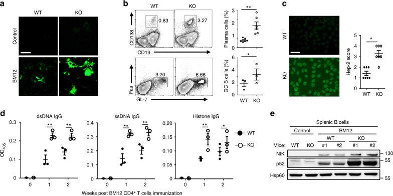 - Fig. 2 Peli1 deficiency aggravates the induction of lupus-like disease. a WT and Peli1 -deficient (KO) mice were intraperitoneally injected with 7.5 million of CD4 + T cell from C57BL/6 mice (control) or from BM12 mice. Representative immunofluorescent images showing IgG deposits in kidney by staining with Alexa Fluor 488-labeled anti-mouse IgG. Scale bar, 100 mum. b Flow cytometric analysis of the percentages of CD19 - CD138 + plasma cells and Fas + GL-7 + germinal center (GC) B cells in WT and KO immunized mice as described in ( a ). Data are presented as a representative plot (left panel) and summary graph (right panel). c Distinct anti-nuclear antibody (ANA) staining patterns of the Hep-2 cell line with serum from WT and KO mice 4 weeks after immunization as described in ( a ). Scale bar, 50 mum. d Enzyme-linked immunosorbent assay (ELISA) of anti-dsDNA, anti-ssDNA, and anti-histone IgG in serum from WT and KO immunized mice as described in ( a ) at the indicate time point. e Immunoblot showing NIK and p52 protein levels in splenic B cells from control and BM12 CD4 + T cells immunized WT and KO mice as described in ( a ). Data are shown as the mean +- SEM based on three independent experiments. Two-tailed Student''s t- tests were performed. * P < 0.05 and ** P < 0.01
