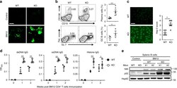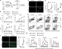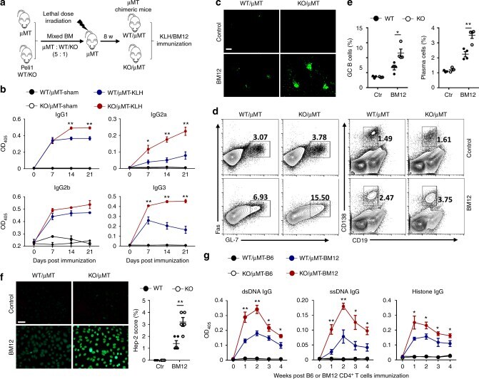- Fig. 3 Peli1 deficiency specifically in B cells promotes autoimmunity in vivo. a Scheme showing how the muMT chimeric mice were constructed for immunization. b Enzyme-linked immunosorbent assay (ELISA) of NP-specific IgG1, IgG2a, IgG2b, and IgG3 in the serum of WT/muMT and Peli1-deficient (KO)/muMT chimeric mice that immunized intraperitoneally with vehicle (sham) or NP-KLH (KLH). c WT/muMT and KO/muMT chimeric mice were intraperitoneally injected with 7.5 million of CD4 + T cell from C57BL/6 mice (control) or from BM12 mice. Representative immunofluorescent images showing IgG deposits in kidney by staining with Alexa Fluor 488-labeled anti-mouse IgG. Scale bar, 100 mum. d , e Flow cytometric analysis of the percentages of Fas + GL-7 + germinal center (GC) B cells and CD19 - CD138 + plasma cells in immunized WT/muMT and KO/muMT chimeric mice as described in ( c ). Data are presented as the representative FACS plots ( d ) and summary graphs ( e ). f Distinct anti-nuclear antibody (ANA) staining patterns of the Hep-2 cell line with serum from WT/muMT and KO/muMT chimeric mice 4 weeks after immunization as described in ( c ). Ctr represents control in the right panel bar graph. Scale bar, 50 mum. g Enzyme-linked immunosorbent assay (ELISA) of anti-dsDNA, anti-ssDNA, and anti-histone IgG in serum from immunized WT/muMT and KO/muMT chimeric mice as described in ( c ) at the indicate time point. Data are shown as the mean +- SEM based on three independent experiments. Two-tailed St