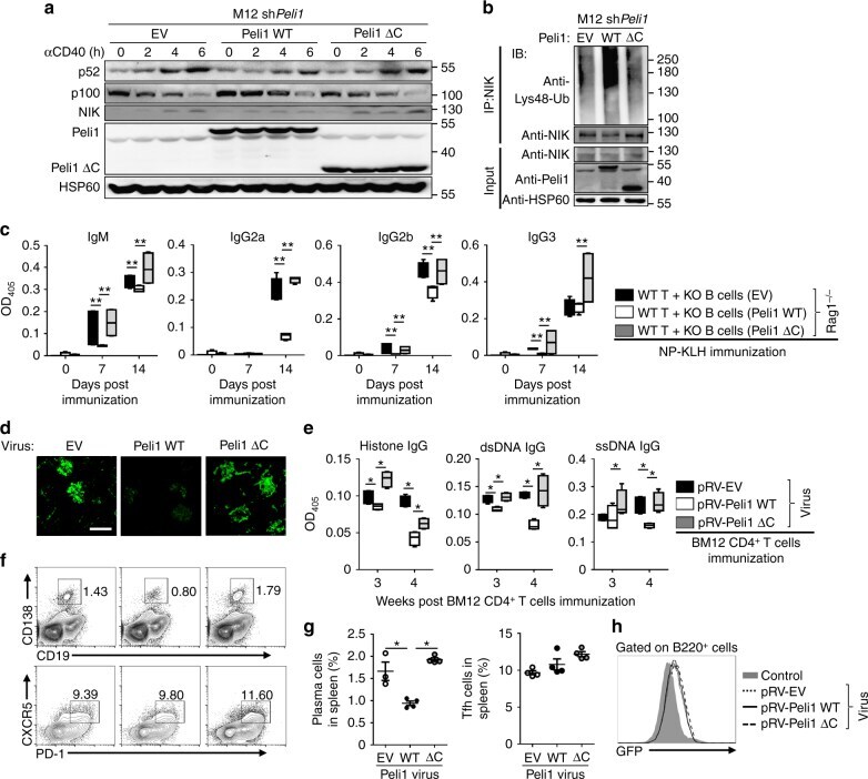 - Fig. 7 Overexpression of Peli1 prevents lupus-like disease. a Immunoblot analysis of p52, p100, NIK, Peli1, Peli1DeltaC and HSP60 in Peli1 -knockdown M12 cells that reconstituted with empty vector (EV), WT full-length Peli1 or Peli1DeltaC that stimulated with anti-CD40 (alphaCD40) at the indicated time points. b Analysis of Lys48 ubiquitination of NIK in Peli1 -knockdown M12 cells reconstituted with EV, WT Peli1, or Peli1DeltaC that stimulated with anti-CD40 (alphaCD40) for 4 h in the presence of MG132. c LISA of NP-specific IgM, IgG2a, IgG2b and IgG3 in the serum of Rag1 -/- mice that transferred with WT T cells plus KO B cells reconstituted with EV, WT Peli1 or Peli1DeltaC, and then immunized intraperitoneally with NP-KLH. d - h Peli1 -deficient (KO) mice were immunized with 7.5 million of BM12 CD4 + T cell to induce lupus-like disease, and then injected with pRV-GFP retrovirus encoding Peli1 or Peli1DeltaC 12 h post-immunization. The IgG deposits in kidney were examined by staining with Alexa Fluor 488-labeled anti-mouse IgG ( d ). Scale bar, 100 mum. The anti-dsDNA, anti-ssDNA, anti-histone IgG in serum were determined by ELISA ( e ). The percentages of CD19 - CD138 + plasma cells, PD-1 + CXCR5 + Tfh cells ( f , g ) and infected B220 + B cells ( h ) in spleens were assessed by flow cytometry. Data are shown as the mean +- SEM based on three independent experiments. Two-tailed Student''s t- tests were performed. * P < 0.05 and ** P < 0.01
