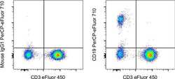 - Normal human peripheral blood cells were stained with CD3 Monoclonal Antibody, eFluor 450 (Product # 48-0038-42) and Mouse IgG1 kappa Isotype Control, PerCP-eFluor 710 (Product # 46-4714-82) (left) or CD19 Monoclonal Antibody, PerCP-eFluor 710 (right). Cells in the lymphocyte gate were used for analysis.