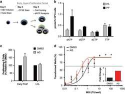- Figure 5 Supplementation with purine nucleosides alone rescues EBV-induced growth arrest. ( a ) Schematic demonstrating staining, infection and sorting protocol to separate proliferating, then arrested (PA) from proliferating, then proliferating further (PP) cells within the early proliferating period. ( b ) Quantification of individual deoxyribonucleotide pools, including dATP, dGTP, dCTP and TTP measured from sorted PA cells (gray) and PP cells (black). ( c ) Percentage of proliferating CD19 + B cells was determined for early proliferating infected B cells and LCLs that were treated with DMSO (black) or supplemented with 30 mu M purine nucleosides (AG) (gray) at the time of infection. The data were analyzed by FACS at day 14 post infection. Error bars represent s.e.m. of three independent donors. ( d ) Quantification of EBV-infected B-cell outgrowth following PBMC infection in the presence of DMSO (black) or 30 mu M purine nucleosides (AG) (red) at time of infection similar to experiments performed in Figure 4 f and g. ( d , inset) Fold change of the transformation efficiency.