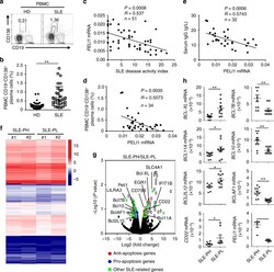 - Fig. 8 PELI1 expression is negatively correlated with SLE disease activity. a , b Flow cytometric analysis of the frequencies of CD19 - CD138 + plasma cells in peripheral blood mononuclear cells (PBMCs) from health donors (HD) and SLE patients. Data are presented as a representative plot ( a ) and summary graph ( b ). c - e Correlation analysis of the PELI1 mRNA expression in PBMCs with the disease activity ( c ), plasma cells frequencies ( d ), and serum IgG levels ( e ) in SLE patients. f Heat map showing differentially expressed genes in PBMCs that isolated from SLE patients with Peli1 high or Peli1 low mRNA expression (SLE-PH or SLE-PL). g Volcano graphs showing the genes differentially expressed in PBMCs between SLE-PH and SLE-PL. h QPCR determining the relative expression of the indicated apoptosis-related and Peli1 genes in PBMCs of SLE-PH and SLE-PL patients. Each dot represents a value of the gene epression results from SLE-PH or SLE-PL patients. Data were normalized to a reference gene, ACTIN . Data are shown as the mean +- SEM based on three independent experiments. Two-tailed Student''s t- tests were performed. * P < 0.05 and ** P < 0.01