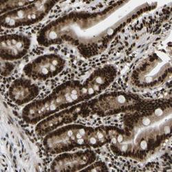 - Immunohistochemical staining of human duodenum shows strong nuclear positivity in glandular cells.