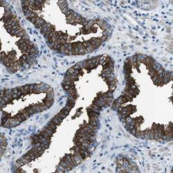 - Immunohistochemical staining of human prostate shows distinct membranous and cytoplasmic positivity in glandular cells.