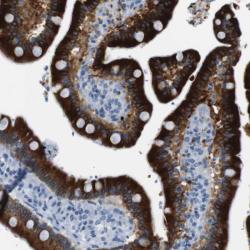 - Immunohistochemical staining of human duodenum shows strong cytoplasmic positivity in glandular cells.