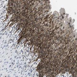 - Immunohistochemical staining of human urinary bladder shows strong membranous and cytoplasmic positivity in urothelial cells.