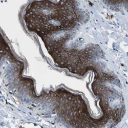 - Immunohistochemical staining of human skin shows distinct cytoplasmic positivity in epidermal cells.