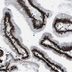- Immunohistochemical staining of human duodenum shows strong nuclear positivity in glandular cells.