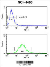 - HLA-G Antibody (Center) flow cytometry analysis of NCI-H460 cells (bottom histogram) compared to a negative control cell (top histogram).FITC-conjugated goat-anti-rabbit secondary antibodies were used for the analysis.