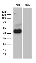 - Western blot analysis of extracts (35 µg) from 2 different cell lines by using anti-PHLDA1 monoclonal antibody. (1:500)