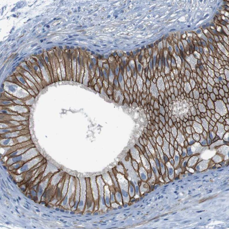 - Immunohistochemical staining of human epididymis shows distinct membranous positivity in glandular cells.