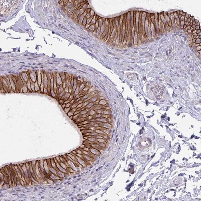 - Immunohistochemical staining of ARVCF in human epididymis using an ARVCF Polyclonal Antibody (Product # PA5-64129) shows strong cell membrane positivity in glandular cells.
