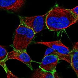 - Immunofluorecent analysis of ARVCF in human cell line SH-SY5Y using ARVCF Polyclonal Antibody (Product # PA5-64129). Staining shows localization to plasma membrane and cell junctions.