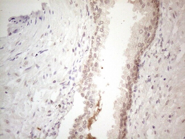 - Immunohistochemical staining of paraffin-embedded human bladder tissue within the normal limits using anti-SPATA22 mouse monoclonal antibody. (Heat-induced epitope retrieval by 1mM EDTA in 10mM Tris buffer (pH8.5) at 120°C for 3 min, TA808420)(1:150