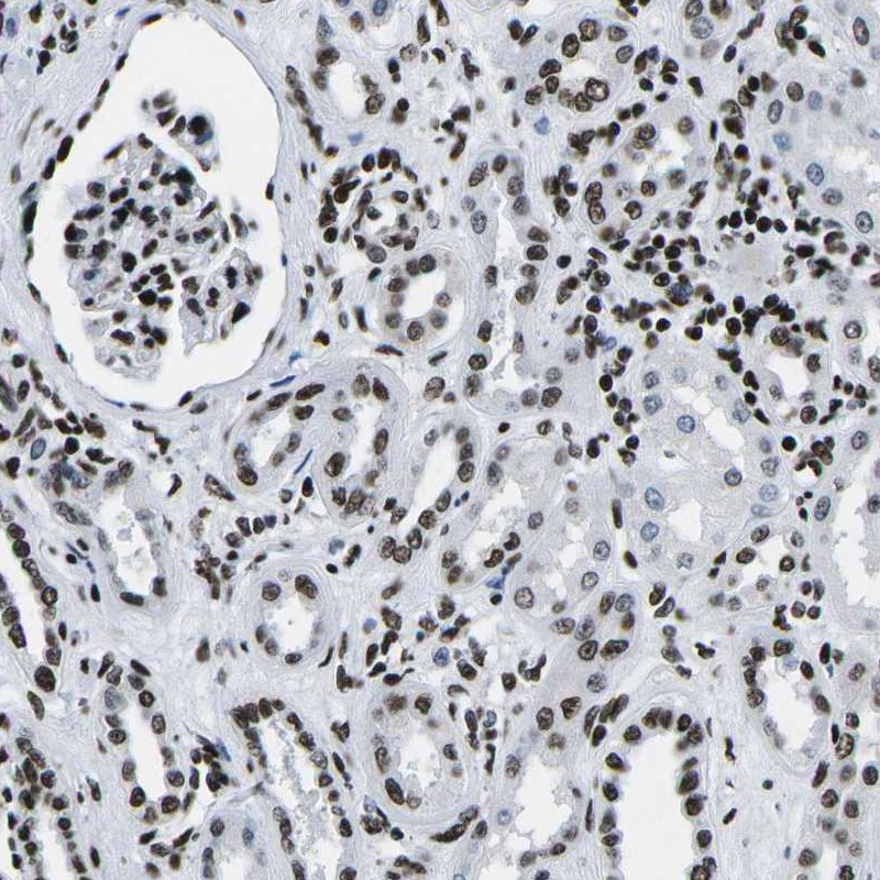 - Immunohistochemical staining of human kidney shows strong nuclear positivity.