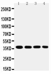 - MTCO1 antibody Western blot. Lane 1: SMMC Cell Lysate. Lane 2: MCF-7 Cell Lysate. Lane 3: RAJI Cell Lysate. Lane 4: SW620 Cell Lysate.